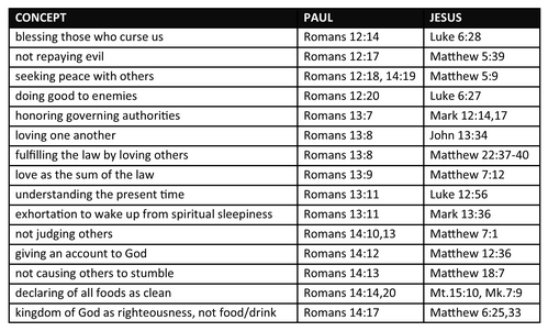 One of the attacks often made on the reliability of the New Testament is that Paul’s teachings differ greatly from the teachings of Jesus. In actuality, many of Paul’s teachings in his letters can be traced back directly to the teachings of Jesus recorded in the gospels, and Romans 12-14 is a great section of scripture to see that. Below I have provided a list (taken from John Stott’s commentary on Romans) that shows specific concepts that Paul takes from Jesus’ teachings and repeats in Romans 12-14.